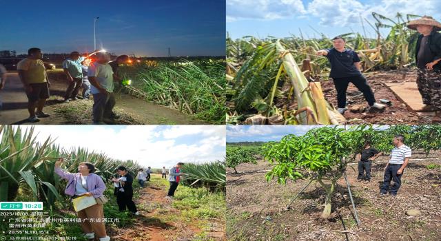 风雨未止,科研人员已奔赴田间地头。南亚所多个研究团队第一时间深入湛江、雷州、徐闻等主要作物产区,实地调研甘蔗、香蕉、剑麻、芒果等作物受灾情况,现场指导农户开展生产自救。